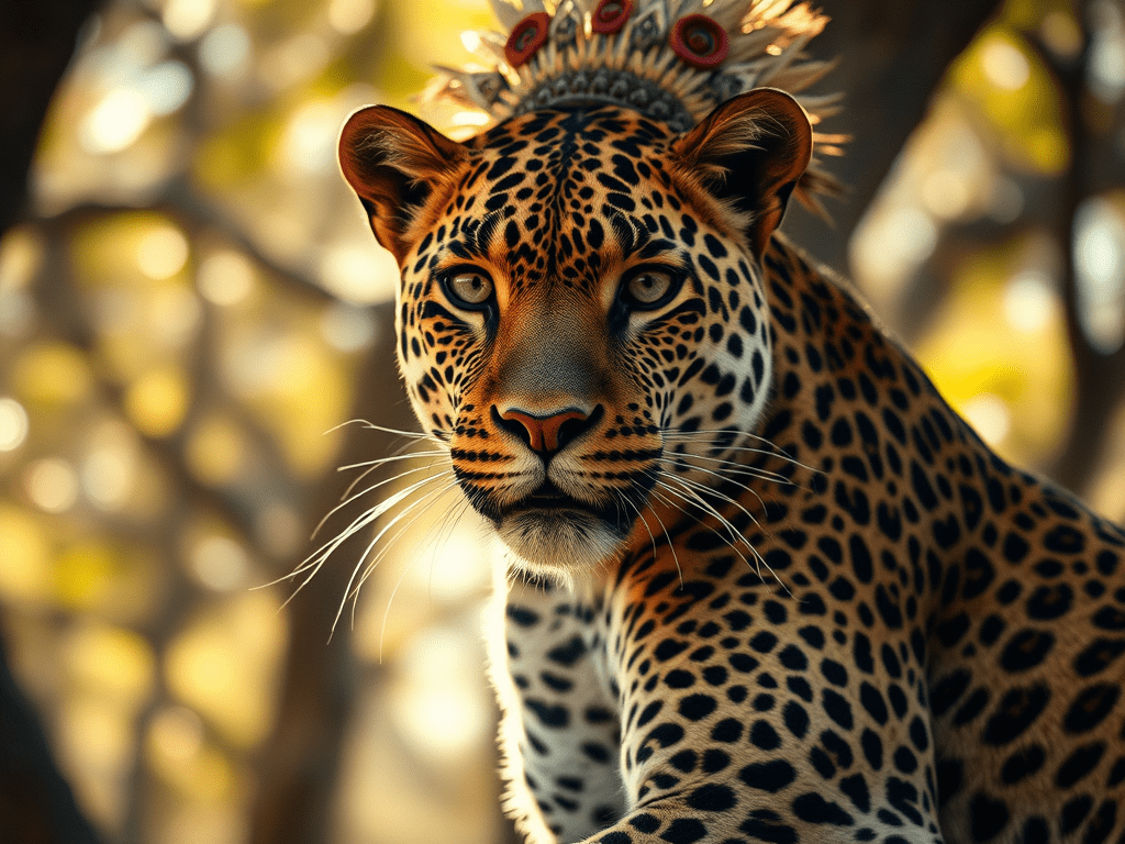Considéré depuis la nuit des temps comme un animal rusé, sa belle peau, qui fait toujours rêver, est sacrée dans la tradition bantoue. La toque de léopard coiffe la tête des chefs coutumiers en guise de couronne. Cette symbolique est solidement ancrée dans le subconscient des bantous.